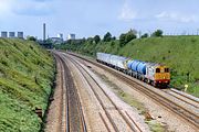 An interesting and innovate freight trial took place during the summer of 1997, conveying an intermodal milk tanker from Penrith to Carlisle. As can be guessed from this meagre load, the trial was not successful. With appropriate 'Milkliner' headboard, 20305 & 20301 pass through Radlett on 12 July 1997 with the 6Z58 12:53 Penrith to Cricklewood. |