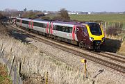 220004 finds a brief patch of sunshine at Tackley on 8 March 2007 as it heads down the Cherwell Valley with the 08:52 Edinburgh to Bournemouth Virgin Cross Country service . Note the flooded fields in the background, a common feature of this location in the winter and early spring. |