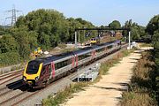 220012 passes Spetchley on 13 September 2023 with the 1V47 08:03 Manchester Piccadilly to Paignton CrossCountry service. There are two closely spaced bridges in the background, carrying the A44 and A4538 roads. |