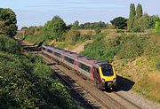 After a bright start, the clouds are building up at Sandy Lane, Kidlington on 22 September 2012, as 220012 speeds southwards with the 1O10 08:27 Manchester Piccadilly to Bournemouth CrossCountry service. Sandy Level Crossing can just be seen behind the rear of the train. |
