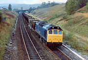 You can imagine the racket this was making! 25251 slowly plods up the bank towards Chinley on 20 October 1983 with the 6H44 11:05 Oakleigh to Tunstead empty stone hoppers. Note that the second wagon appears to have been recently overhauled, and is sporting freshly painted bogies. |