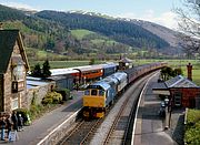25313 & 26004 arrive at Carrog station on 18 April 1998 with the 10:00 train from Llangollen, during the Llangollen Railway's Diesel Gala. Note the absence of any nearby houses. The village of Carrog is on the other side of the River Dee, and the station is actually nearer to the small village of Llidiart y Parc. |