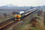 On a very dull and misty 23 February 1985, 25034 & 25044 pass the site of Wendlebury Halt (on the Oxford to Bicester line) with the Railway Enthusiasts Society 1Z26 07:30 St Pancras to Derby 'North Midlander' railtour. This tour traversed this former LMS route as far as Bletchley, before heading up the West Coast Mainline to Stafford, where this classic motive power combination was exchanged for the equally vintage 45048. Wendlebury Halt had a very brief existence, opening in 1905 and closing as early as 1926. Even that doesn't tell the whole story, as it was temporarily closed during the First World War. |