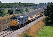 31459 climbs through the cutting at Harbury on 26 June 1991 with a short engineer's train. A classic location that became more and more overgrown during later years. The train is nearing the summit of over five mile of continuous gradient from near Leamington Spa. |