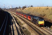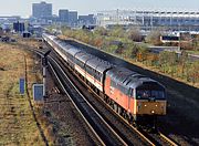 47792 Saint Cuthbert approaches Whitacre Junction on 14 September 1997 with the diverted 1A43 12:19 Wolverhampton to Euston Virgin West Coast service. The 47 would work the train as far as Nuneaton. The train's locomotive, 86240 Bishop Eric Treacy is bringing up the rear. Directly behind the 47 is DVT 82132 West Midlands. |