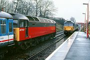 47710 passes Radley at high speed with the 16:00 Oxford to Paddington Network SouthEast service on 14 March 1991. At the time these trains were branded as 'Network Express' services and generally only stopped en-route at Reading. 47710 had moved from Eastfield to Old Oak Common during the previous year in order to take over from the Class 50s on these Thames Valley services. These ex Scottish machines were not generally welcomed by enthusiasts at the time, as they were replacing the hugely popular 50s. Time however has since moderated this viewpoint! |