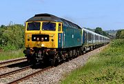 D1755 (47773) seems to spend most of its time on the rear of trains. On 19 July 2023 it brings up the rear of the Vintage Trains 1Z15 07:56 Birmingham New Street to Norwich 'East Anglian' railtour, as it passes Burbage Common in the rain, led by 37403 Isle of Mull. |