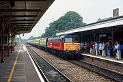 Parcels sector red liveried 47703 The Queen Mother calls at Shipton station on 18 June 1994 with the Pathfinder Tours 1Z56 07:17 Worcester Shrub Hill to Norwich 'Norfolk Explorer' railtour. The fact that vegetation is encroaching onto both platforms is a clue that this station is not the busiest on the Cotswold Line! A loco hauled train stopping here is something of a novelty, hence my reason for taken the picture, even in such poor light. |