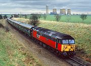 A slightly different angle at Didcot North Junction on 24 March 1991. 47711 heads north with an Old Oak Common to Oxford ECS, prior to working the 1F08 11:30 Oxford to Paddington Network SouthEast service an hour later. Didcot Power Station dominates the background, although the view across the fields has just been interrupted by the then recently constructed Tesco distribution centre. On the right is the depot of Tappins coaches. |