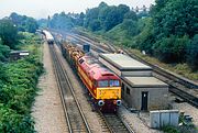 47711 County of Hertfordshire heads away from Bicester North station on 6 August 1998 with the 4C13 11:21 Calvert to Bristol Avon Binliner empties. Annoyingly the train lost its path over the single line to Oxford, and was now running two hours late, with the result that the lighting had become hopelessly head on. This was especially irritating, as for most of that time it was sat at the level crossing in the background of this picture! I have included it here, as a Network SouthEast loco on this working was a bit of a novelty. |