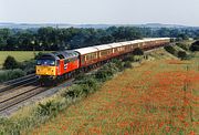 47791 Venice Simplon Orient Express does not quite have the right name for the stock it is hauling here, but not that far off! It is pictured passing Culham on 22 June 1995 hauling the Statesman Pullmans, with an Ascot to Liverpool race special. Unfortunately the light was fading rapidly, but at least the poppies in the foreground add a splash of colour. |