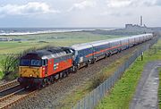 With the choppy North Sea in the background, 47792 Saint Cuthbert passes Hart on 12 April 1998 with the diverted 1S14 09:45 Doncaster to Glasgow Central GNER service, with 91028 on the rear. Diverted away from its usual route by weekend engineering works, it would however rejoin the East Coast Mainline at Newcastle. Saint Cuthbert is an appropriate (though accidental) choice of traction, as between Newcastle and the Scottish border, the train would pass within sight of the island of Lindisfarne, where the Anglo-Saxon monk Saint Cuthbert spent a large part of his life. |