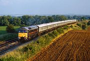 47705 passes Shipton at speed on 8 October 1989 with the 1B31 13:45 Paddington to Hereford Network SouthEast service, which although it was late afternoon, was the first down train of the day over the Cotswold Line on a Sunday at this time. As virtually always seemed to be the case in the 1980s, this was running exactly to time, which was lucky considering the encroaching shadows! This is one of the very few occasions on which I saw one of the ex Scottish Region Class 47/7s on the Cotswold Line. |
