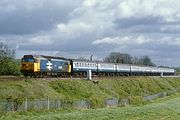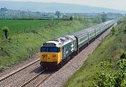One of the very few occasions on which I saw a Class 50 in the revised version of Network SouthEast livery on the Cotswold Line. 50005 Collingwood passes Shorthampton on a very gloomy 8 May 1988 with the 1B33 14:00 Paddington to Hereford Network SouthEast service. |