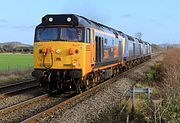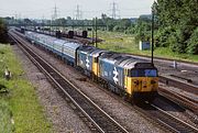 50008 Thunderer passes Up Hatherley on 7 July 2017 with the 4Z01 08:50 Okehampton to Chaddesden Sidings, conveying Network Rail rail grinders DR79304, DR79303, DR79302 & DR79301. This was running exactly one hour early. Although Thunderer never did much real engineer's work once it had been painted into this 'Laira Blue' livery in 1991, this still invokes the good old days of DCWA allocated departmental Class 50 workings. |