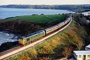 50002 Superb gleams in the autumn sunshine, as it rounds the curve near Broadsands on 16 October 1993 with the 12:25 Paignton to Kingswear service, during the Paignton & Dartmouth Steam Railway's Class 50 Event. |