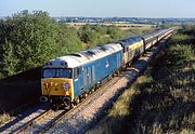 50001 Dreadnought passes Combe on 2 October 1988 with the 1B31 13:45 Paddington to Hereford service. Only the rear coach spoils an otherwise completely uniform rake of Network SouthEast Mk.2s, the loco also being in matching NSE livery (the second version but before a darker a shade of blue was used). Ironically two years previously I had photographed the same locomotive in a very similar spot, but coming from the opposite direction. |