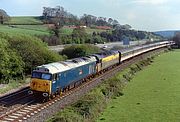 This is my only picture of 50010 Monarch at work on the Cotswold Line. On a very dull 5 May 1982 it leaves Charlbury station, and passes Cornbury Park, with the 1A51 16:03 Worcester Shrub Hill to Paddington service. This was just a few weeks before the loco hauled trains on the route were cut back to a couple of morning and evening commuter services. |