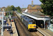 50002 Superb passes through Heyford station on 14 September 1985 with the 1O15 09:00 Manchester Piccadilly to Weymouth service, which it had taken over at Birmingham New Street. Laira didn't like to let its locos spend too long off region, and it had only worked up to the West Midlands a little earlier that morning with the 1E54 06:50 Paddington to Hull. Note the raised section of platform in the foreground and on the opposite platform, which was a temporary measure to combat the large gap resulting from the cant of the track. The corner of the station building can also just be seen. This was redundant at the time and has since been removed. |
