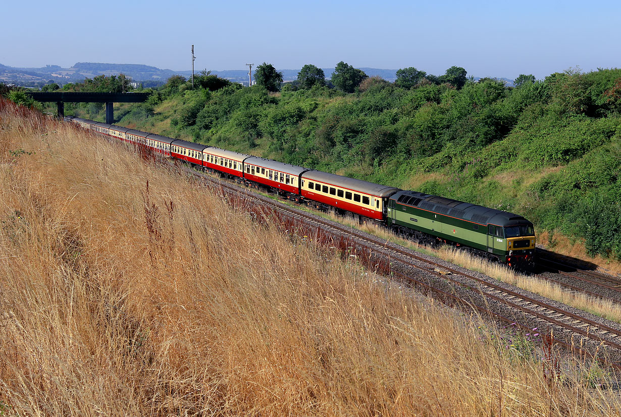 D1944 (47501) Craftsman brings up the rear of the Saphos Trains 1Z60 06:40 Wolverhampton to Kingswear 'English Riviera Express' railtour at Standish Junction on 6 August 2022. Heading the train is classmate 47614. Although the far side of the cutting still looks reasonably green, the parched grass in the foreground is typical of the extremely hot summer of 2022. |