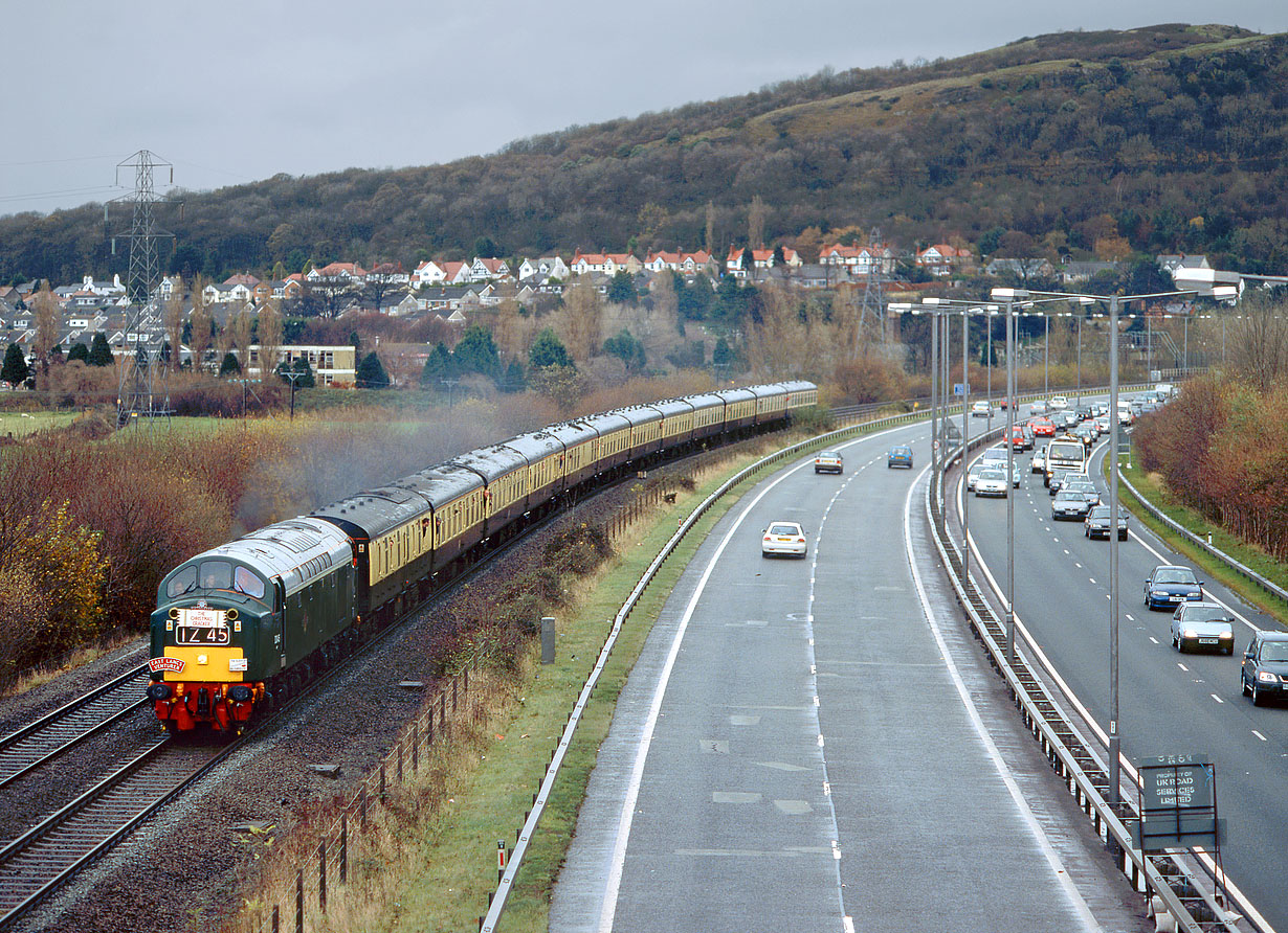 D345 (40145) runs alongside the A55 at Mochdre on 30 November 2002 with the Pathfinder Tours / Class Forty Preservation Society 1Z45 07:00 Crewe to Holyhead 'Christmas Cracker IV' railtour. This was the first Class 40 on the national network since D200 ran its final railtour in 1988. The weather was awful on both occasions! |