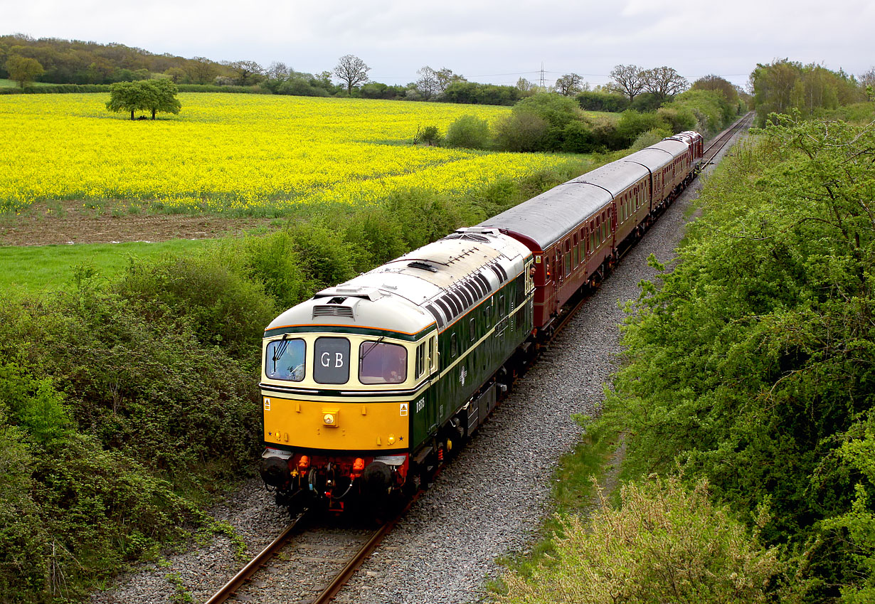 D6515 (33012) Lt Jenny Lewis RN passes Greatmoor on 29 April 2018 with the London Transport Museum 1Z33 10:22 Harrow-on-the-Hill to Quainton Road (via Calvert) 'Class 20 Metropolitan' Railtour. 20227 & 20142 are on the rear. This location is approximately half way between Quainton Road and Calvert, and reached by a long and exceedingly muddy bridleway. |