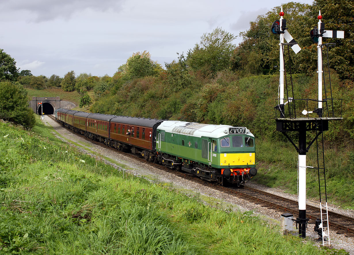 D7612 emerges from Greet Tunnel and approaches Winchcombe's home signals whilst working the 12:45 Gotherington to Toddington service, during the Gloucestershire Warwickshire Railway's Diesel Gala on 2 October 2010. A mostly sunny day until around midday, when as if from nowhere the cloud appeared and built up rapidly. All the photographers stood at this spot thought this was going to be hopeless, but just before D7612 emerged from the tunnel it actually brightened up a little (look, the loco is casting a shadow!), before totally collapsing for most of the rest of the day. |