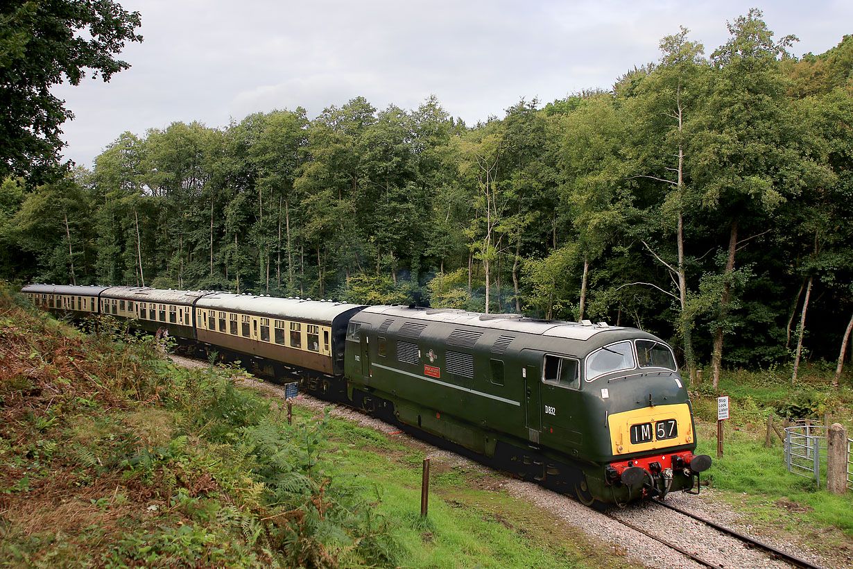 The first visit of a Warship to the Forest of Dean. D832 Onslaught passes the footpath crossing at Upper Forge on 15 September 2018 with the 10:43 Parkend to Lydney Junction service, during the Dean Forest Railway's Diesel Gala.