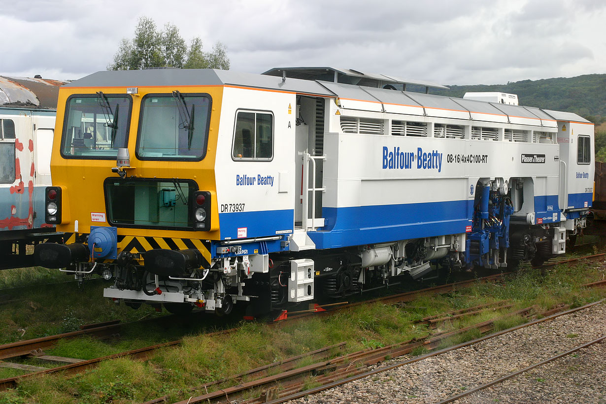 Balfour Beatty loaned Plasser & Theurer 08-16/4x4C100-RT Universal levelling, lining and tamping machine DR73937 to the Gloucestershire Warwickshire Railway in 2003. On 4 October, it is seen in the yard at Winchcombe (pictured from a passing train).