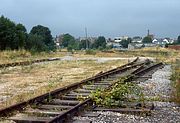 The last remaining section of track at Long Marston station, pictured on 14 August 1983. With the majority of the trackwork recently lifted, just the connection into the army depot remains, and that too would soon be gone. This location is now in the middle of an industrial estate, with my vantage point probably inside one of the 'big sheds'! |