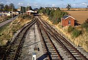 Verney Junction reverts to nature, with sizeable ash trees growing between the rails. This view, taken on 27 March 2012, shows that both platforms are intact, although apart from the station master's house, no buildings remain. Will trains ever pass this way again? There are plans to reopen the line, although it is doubtful whether such a remote station will see further use. |