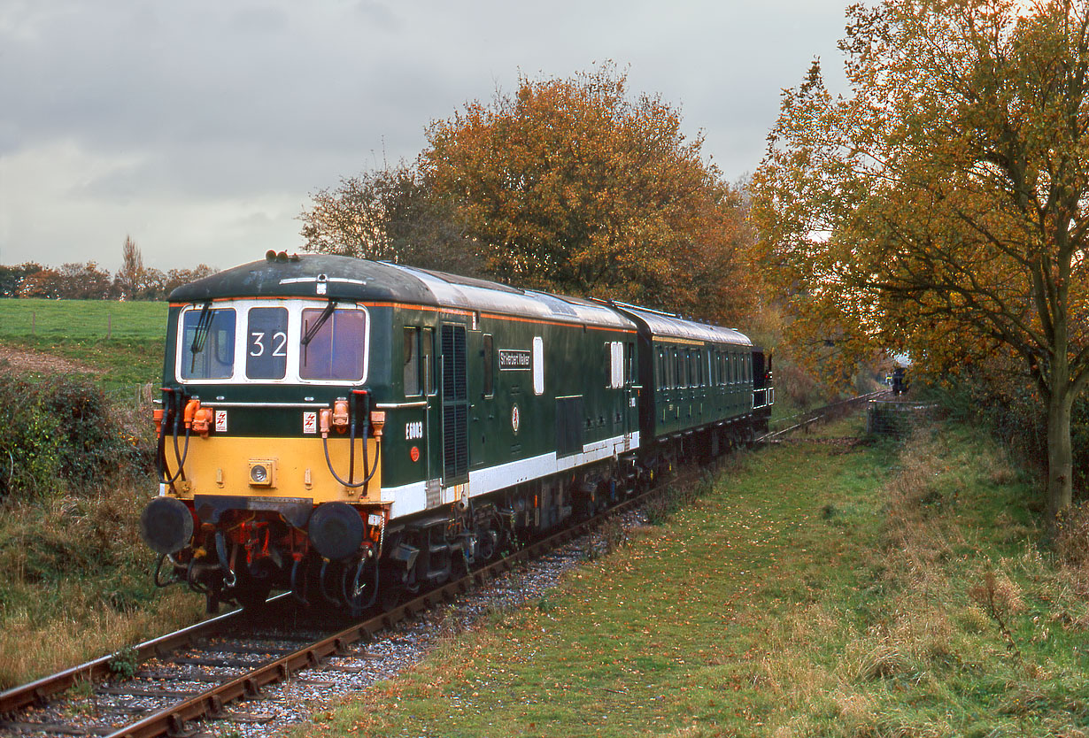 E6003 Sir Herbert Walker trundles along the Lavender Line at Isfield on 15 November 1998, heading back to the line's only station after yet another trip up the mile long line. The loco left the line shortly afterwards, first of all spending a few years at the Great Central Railway, before ending up at the Swindon & Cricklade Railway. |