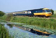 43066 Nottingham Playhouse passes Cossington on 11 May 2001 with the 1D50 17:55 St Pancras to Nottingham Midland Mainline service. It's almost as if the HSTs painted in this livery used semi water soluble paint for the yellow front end! This one displays the typical blotchy faded look. |