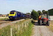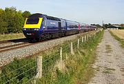 43032 The Royal Regiment of Wales passes Chilson, on the Cotswold Line with the 06:09 Abergavenny to Paddington First Great Western 'Cathedrals Express' service on 10 August 2007. Note the use of a hired in set of Midland Mainline coaches, used to augment the FGW fleet while their coaches are being refurbished. Unfortunately one element of this refurbishment is an increase in the seating density, somewhat detracting from the HST's quality image. |