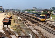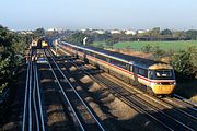 43034 accelerates away from Swindon on 24 June 1994, and passes Highworth Junction, whilst working the 1A25 07:02 Swansea to Paddington service. The line diverging to the right leads to the Rover car plant, while on the left are the engineer's dept sidings. |