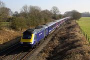 43067 rounds the curve at Gateforth on 14 March 2008 with the 1A62 12:30 Sunderland to Kings Cross Grand Central service, unfortunately just after the sun had disappeared into a bank of high cloud. Note how the black livery of the power car shows off the ripples in the body panels. |