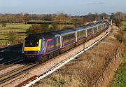 One of the few remaining unrefurbished First Great Western HST power cars, 43034 The Black Horse races past the site of Shrivenham station (between Didcot and Swindon) with the 1C13 12:00 Paddington to Weston-super-Mare service on 15 November 2007. |