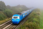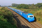 43062 John Armitt brings up the rear of the 1Q15 06:50 Derby RTC to Swansea Network Rail New Measurement Train at Chalford on 3 September 2019. Almost hidden by the lineside bushes, 43013 Mark Carne CBE is the lead power car. |