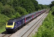 43035 speeds past the site of Shrivenham station on 27 June 2011 with the 1L38 07:58 Swansea to Paddington First Great Western service. The remains of both platforms are still in place, although you wouldn't know it from the amount of vegetation on the down platform! |