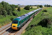 43034 TravelWatch SouthWest is pictured near Ascott-under-Wychwood on the glorious evening of 29 June 2018, as it heads up the Cotswold Line with the 1W03 18:22 Paddington to Hereford GWR service. This location is between Ascott-under-Wychwood and Shipton stations, close to where the Oxfordshire Way long distance footpath crosses the line. |