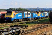 43075, 43073, 43045 & 43060, pictured at Long Marston on 22 August 2021. The four off lease power cars were brought to the site a few weeks earlier by 57312. Note the old and new branding on the nearest two power cars, and the Colas Rail stickers on the other two. |