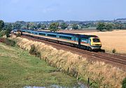 An interesting working occurred on the former Great Western Mainline on Bank Holiday Monday 27 August 2007. Instead of one of the usual First Great Western HSTs on this route, this is a Midland Mainline set hired to Virgin Trains! Running 25 minutes early, 43072 Derby Etches Park leads the 5Z53 07:10 Laira to Reading ECS past Shrivenham, prior to working the 1Z53 11:45 Reading to Leeds Virgin Trains special in connection with the Reading Festival. It originated from Laira due to having worked the 1V49 09:41 Newcastle to Newquay Virgin service two days previously. For the record 43060 was the rear power car. Unfortunately what started out as a sunny morning rapidly deteriorated into a cloudy day, but luckily I just got this in a small patch of sun. |