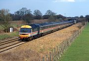 43080 passes Kings Sutton on 31 May 1994 with the 1M25 16:16 Bournemouth to Manchester Piccadilly InterCity service. Although it seems to have had a fairly recent repaint, at least to the red and white part of the livery, this obviously hasn't extended to the large number on the front end, which is now barely legible. Non standard, so not part of the painting specification! |