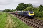 43071 passes Aldington under brilliant blue skies on 16 June 2010 with the 1W29 11:22 Paddington to Great Malvern First Great Western service. Previously a well wooded cutting, the clearance of trees here has opened up a welcome new Cotswold Line viewpoint. However, judging from past experience, all the cut down vegetation will soon grow back again! |