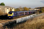 43125 accelerates away from Swindon with the 09:29 Swansea to Paddington First Great Western service on 31 October 2008. This high embankment which carries the line over the A420 Swindon to Oxford road has been the scene of several landslips in the past, but dumping of ballast and other strengthening work has largely now cured the problem. However, there appears to be some unevenness in the track with a noticeable hump by the four and fifth coaches, although possibly accentuated by the long lens used here. |