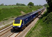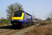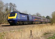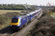 43071 speeds past Acton Turville with the 13:45 Paddington to Swansea First Great Western service on 27 March 2007. At this time the whole FGW HST fleet had just about been repainted into this livery, only for yet another livery to be launched! It almost seems that that a new livery is launched as soon as the final vehicle has been painted in the previous colours! |