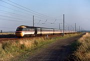 43077 brings up the rear of the Hertfordshire Railtours 07:15 Derby to Paignton 'Torbay Express' railtour on 6 May 1990. It is taking the west curve at Didcot North Junction, a route not normally used by passenger trains. The lead power car is similarly liveried 43081. |