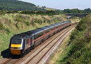 Not a new livery, but just the effects of a recent windscreen wash! 43125 passes Grove on 14 July 2014 with the 1L46 09:55 Cardiff Central to Paddington First Great Western service. Tree clearance work in readiness for the forthcoming electrification has allowed a slightly wider viewpoint at this location. |
