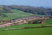 With the tower of St Mary's church, Charlbury visible in the distance, 43128 leads the 13:12 Great Malvern to Paddington ''Cotswold & Malvern Express' past Cornbury Park on 4 July 1985. At the time this and the balancing down working (the 10:10 Paddington to Great Malvern) were the only HST worked services on the Cotswold Line. At around this time there were reports in the local press of a wallaby being seen on the line in this area, although no local zoo or private animal collection admitted to losing any animals! |