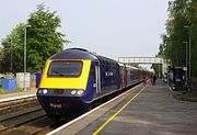 43078 pulls away from Hanborough station on 2 May 2017 with the 1W02 17:22 Paddington to Hereford GWR service, passing the former station master's house. The remains of the former down platform can just be seen opposite the rear half of the train. |